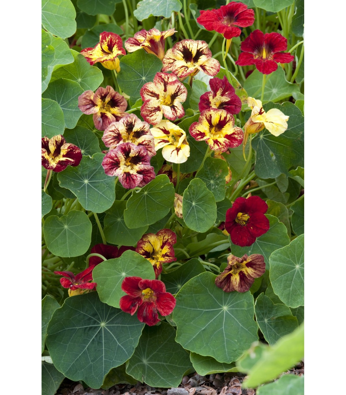 La Capuchina Bloody Mary (Tropaeolum majus) es una variedad ornamental muy llamativa, conocida por sus flores intensamente rojas con matices oscuros, que aportan un toque vibrante y elegante a cualquier jardín, balcón o maceta. Su color rojo profundo es ideal para quienes buscan un impacto visual fuerte y original.