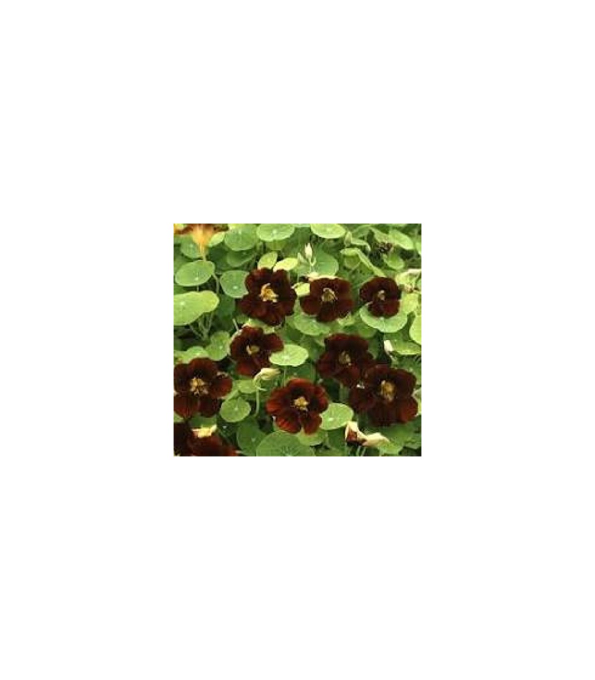 Capuchina con flores de un color oscuro, casi negro, que tiene matices morados o rojizos, lo que le da un aire sofisticado. Las hojas, en contraste, suelen ser de un verde brillante, creando una combinación muy atractiva visualmente
